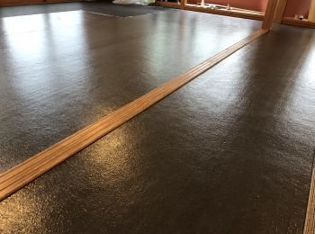 合板の上にダイウレシートを敷き、さらにその上にタイルカーペットを施工。