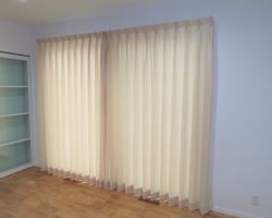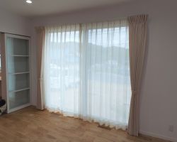 リビングの掃き出し窓には、北欧風の部屋の雰囲気に合わせて、ナチュラルで柔らかい無地調のドレープカーテンを取り付けました。